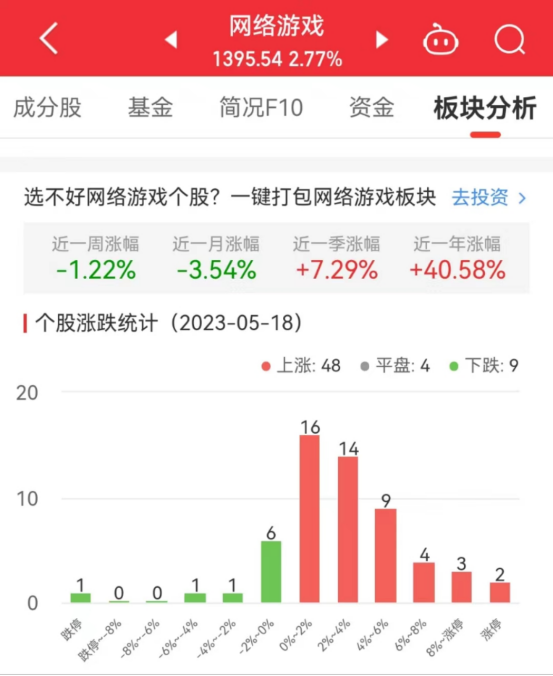 中国经济网北京5月18日讯今日,网络游戏板块整体涨幅2.77%,其中48只股票上涨,4只股票平盘,9只股票下跌。