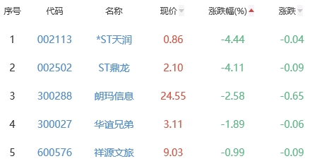 *ST天润、ST鼎龙、朗玛信息、华谊兄弟、祥源文旅位列涨幅榜后五位,涨幅分别为-4.44%、-4.11%、-2.58%、-1.89%、-0.99%。