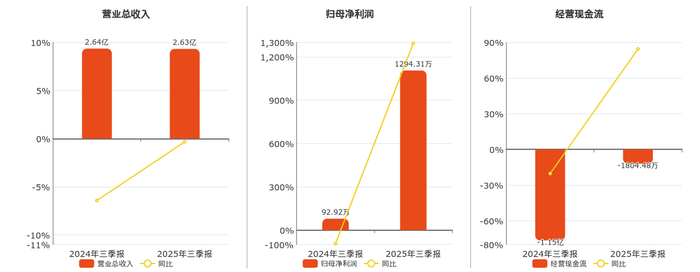 公司营业总收入为2.63亿元,较去年同报告期营业总收入减少85.92万元,同比较去年同期下降0.33%。归母净利润为1294.31万元。经营活动现金净流入为-1804.48万元。