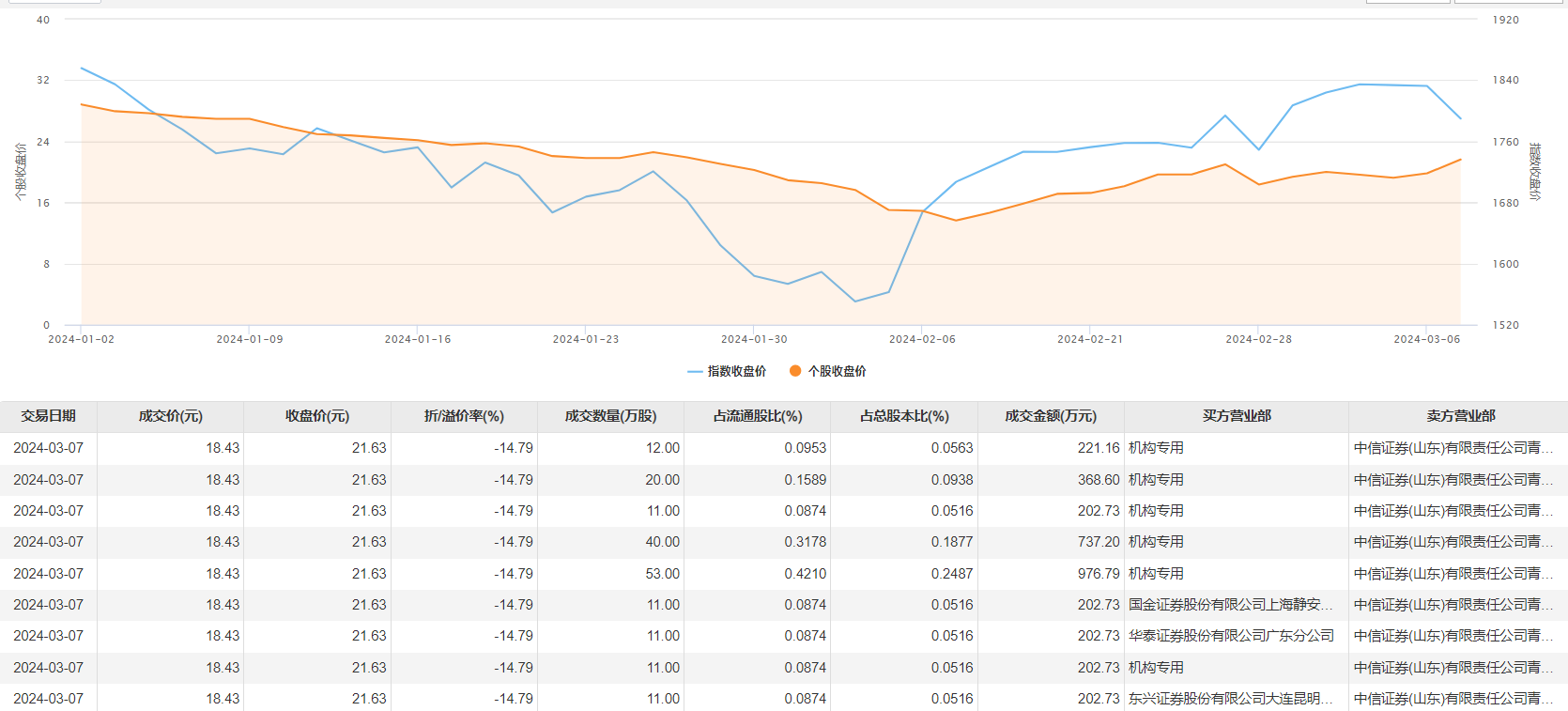 3月7日大宗交易成交180万股,成交额3317.4万元,占当日总成交额的4.65%,成交价18.43元,较市场收盘价21.63元折价14.79%。