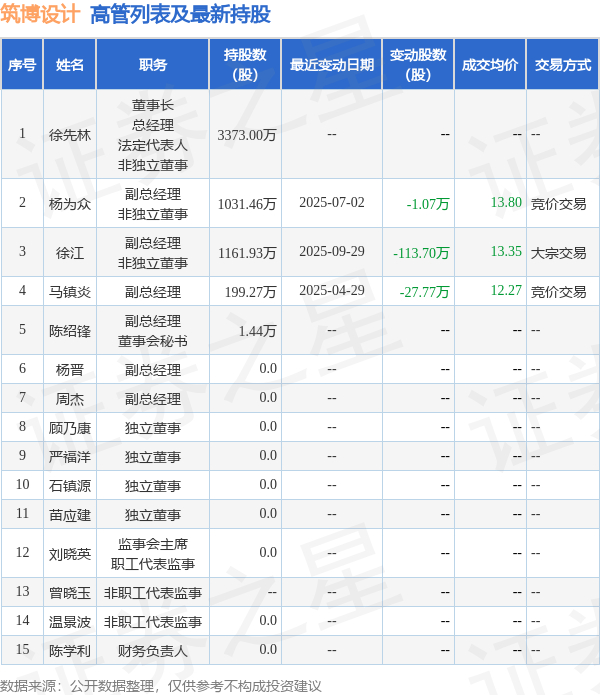 筑博设计的高管列表及最新持股情况如下:
