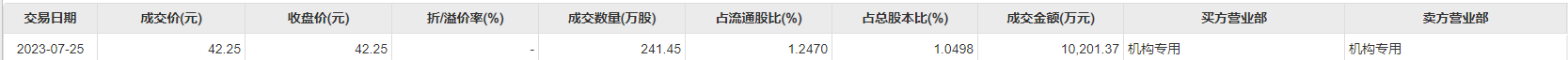 今日大宗交易成交241.45万股,成交额1.02亿元,占当日总成交额的13.97%,成交价42.25元,较市场收盘价持平。