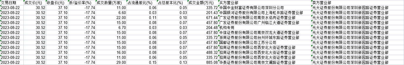 8月22日大宗交易成交173.3万股,成交额5289.11万元,占当日总成交额的6.56%,成交价30.52元,较市场收盘价37.1元折价17.74%。