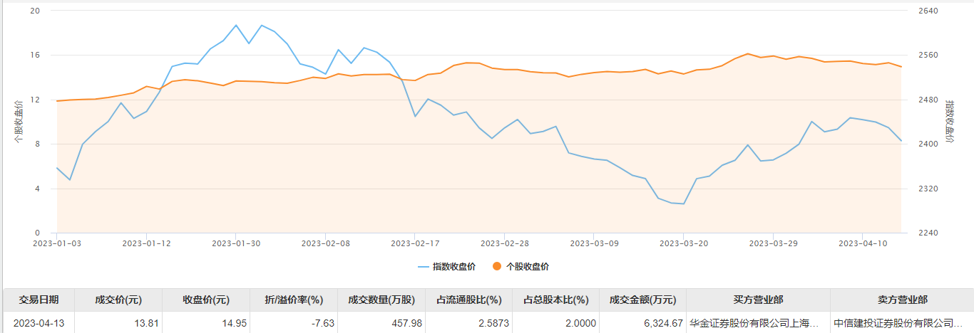 4月13日大宗交易成交457.98万股,成交额6324.67万元,占当日总成交额的61.41%,成交价13.81元,较市场收盘价14.95元折价7.63%。