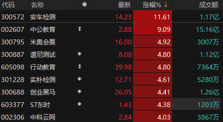 上证报中国证券网讯 10月14日午后,社会服务板块震荡走高。截至13时15分,安车检测涨超11%,中公教育涨逾9%,米奥会展、谱尼测试、行动教育、实朴检测等多股涨逾4%。