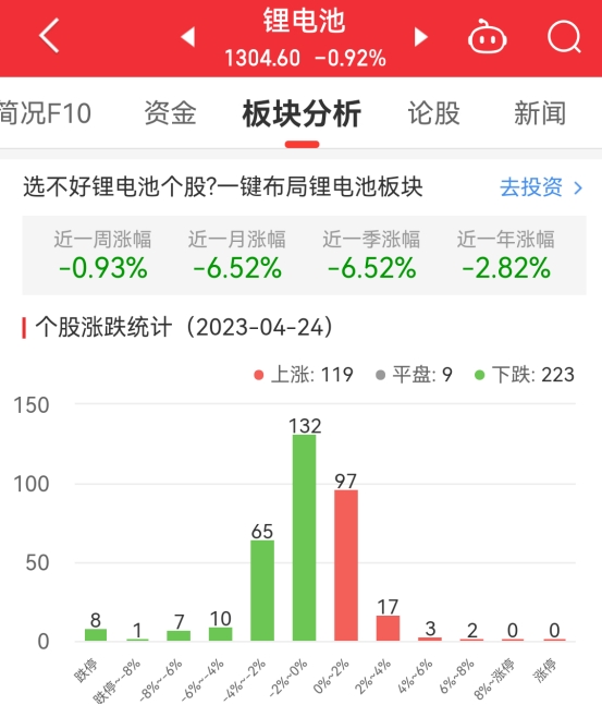 中国经济网北京4月24日讯今日,锂电池板块整体跌幅0.92%,其中119只股票上涨,9只股票平盘,223只股票下跌。