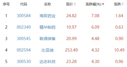 其中,海辰药业、精华制药、联得装备、比亚迪、达志科技位列板块涨幅前五位,涨幅分别为7.08%、6.09%、4.48%、4.32%、4.30%。