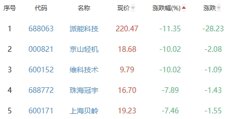 派能科技、京山轻机、维科技术、珠海冠宇、上海贝岭位列涨幅榜后五位,涨幅分别为-11.35%、-10.02%、-10.02%、-7.89%、-7.46%。