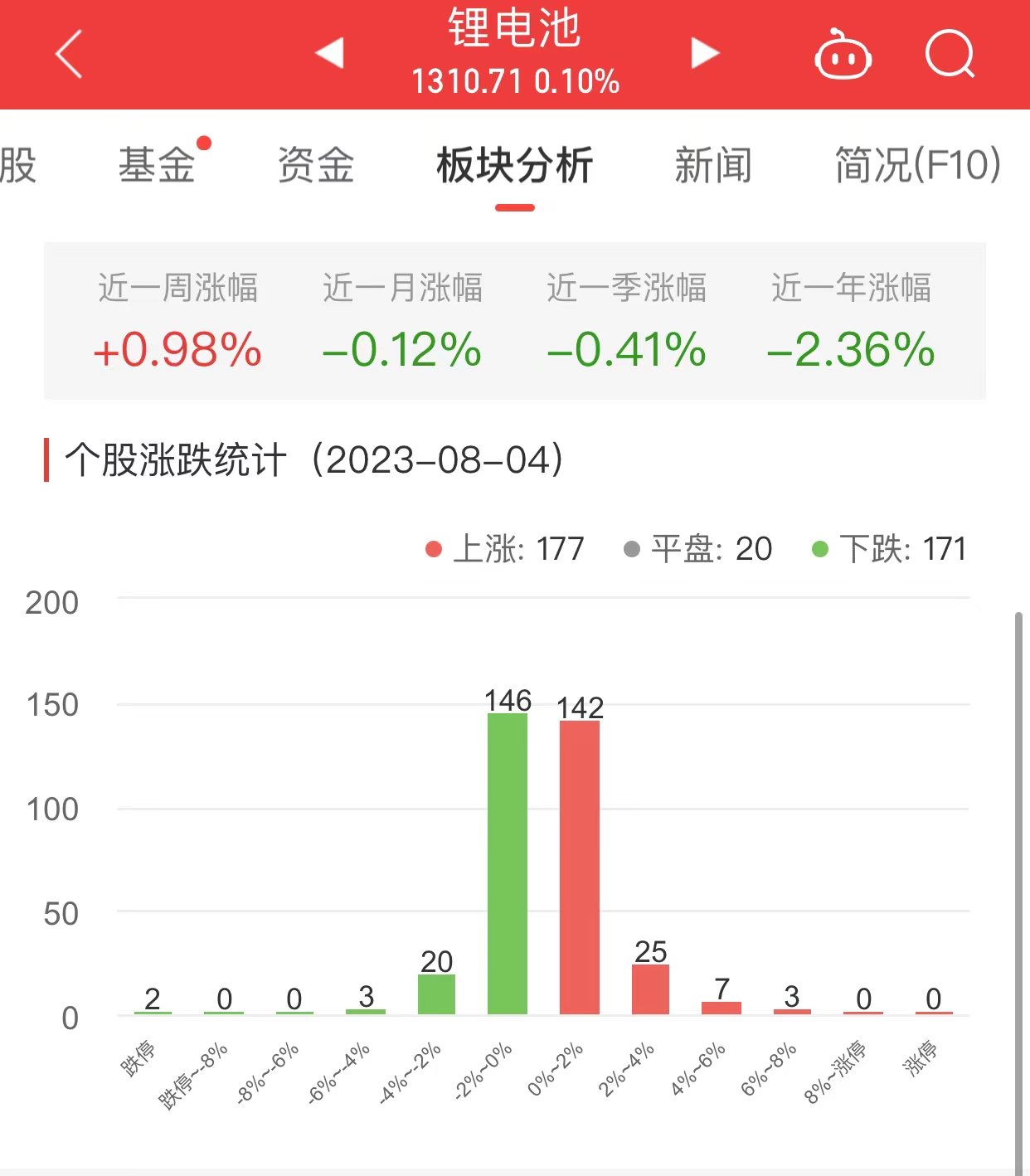 中国经济网北京8月4日讯今日,锂电池板块整体涨幅0.1%,其中177只股票上涨,20只股票平盘,171只股票下跌。