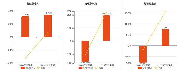 公司营业总收入为13.71亿元。归母净利润为1181.75万元。经营活动现金净流入为2.56亿元。