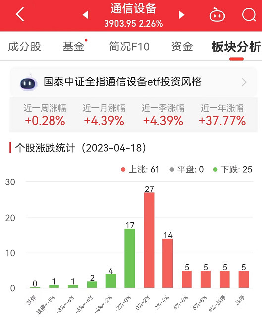 中国经济网北京4月18日讯 今日,通信设备板块整体涨幅2.26%,其中,61只股票上涨,25只股票下跌。