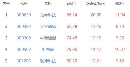 其中,光库科技、天孚通信、中际旭创、新易盛、联特科技位列板块涨幅前五位,涨幅分别为20.00%、15.46%、15.15%、14.42%、12.21%。