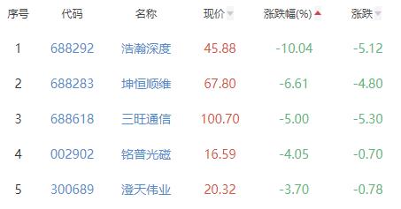 浩瀚深度、坤恒顺维、三旺通信、铭普光磁、澄天伟业位列涨幅榜后五位,涨幅分别为-10.04%、-6.61%、-5.00%、-4.05%、-3.70%。