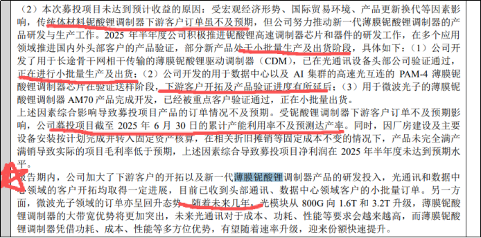 市场预期归市场预期,从半年报公司对2020年定增7.1亿(实际6.97亿)募投项目说明中,披露了薄膜铌酸锂调制器等产品的出货情况,目前只是小批量生产和出货,结合当前中下游对400G、800G和1.6T的需求迭代来看,把公司阐述翻译过来就是:目前产能利用率不及预期是因为市场对超高速光连接的需求还在初期,未来会很强劲。看来薄膜铌酸锂需求放量还需要时间验证,而对于现在的炒作还是仁者见仁智者见智了。
