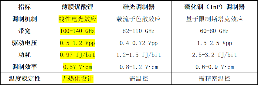一个是薄膜铌酸锂调制器、薄膜铌酸锂PAM-4调制器芯片、体材料铌酸锂调制器领域。公司在薄膜铌酸锂调制器(TFLN)已实现重要突破,这东西属于CPO光模块(“易中天”)的上游。TFLN调制器凭借其超高速率、低功耗和高集成度等优势目前被市场预期是800G/1.6T光模块的核心器件。对比目前其他硅光和磷化铟技术路线,下表对比明显可见,薄膜铌酸锂这种光电材料可具有100GHz以上的带宽,功耗明显低于硅光和磷化铟方案,且高温下性能稳定,无需昂贵的TEC(热电制冷器)进行温控。