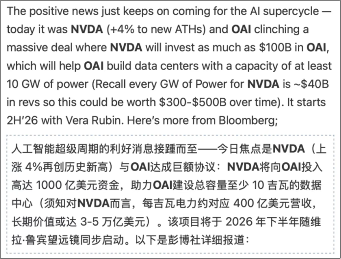 海外算力链又出不少利好消息,最近主角是OpenAI,周末刚公布要与国内消费电子龙头立讯精密(002475.SZ)合作签署协议,共同打造一款消费级设备,布局终端AI,周一又宣布与英伟达(NVDA.O)合作。为了支持包括数据中心和电力容量在内的部署,计划在新NVIDIA系统部署期间向OpenAI投资高达1000亿美元。英伟达将助力OpenAI建设总容量至少10GW的数据中心。