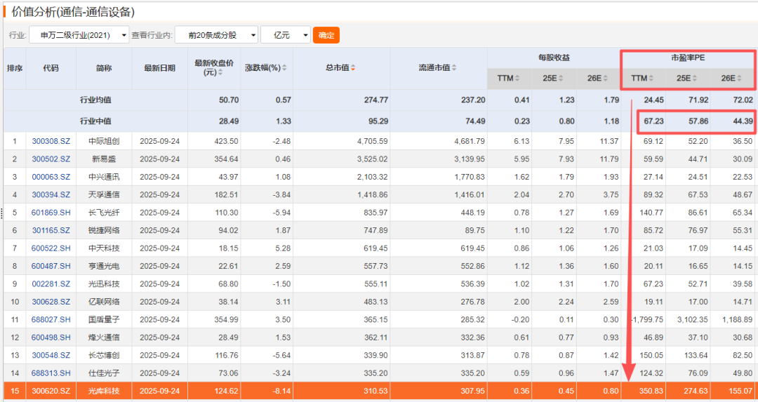 最近A股相关概念股还是比较热门的,比如光库科技(300620.SZ),4月初至今公司股价涨幅超250%,短期股价最高翻了四倍,今年上半年仅5.97亿的营收,5187万的净利润。最近连续回调,相对估值PE也达到了惊人的350倍(TTM),而加上市场对未来业绩预期后,相对估值PE(动态)近300倍。