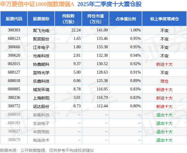 申万菱信中证1000指数增强A的前十大重仓股如下: