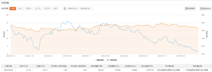 今日大宗交易成交439.85万股,成交额1.2亿元,占当日总成交额的59.01%,成交价27.3元,较市场收盘价溢价1.98%。