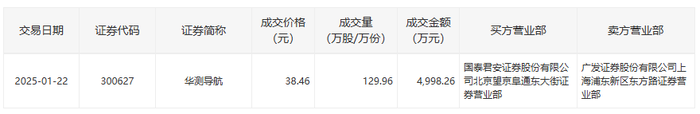 华测导航今日大宗交易折价成交129.96万股,成交额4998.26万元