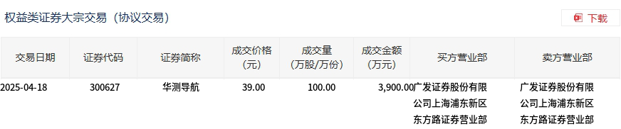 华测导航今日大宗交易折价成交100万股,成交额3900万元