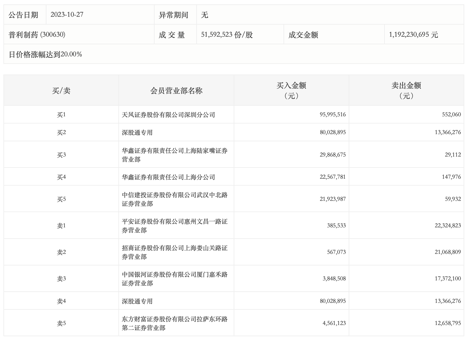 10月27日,普利制药今日涨停,全天换手率达16.02%,振幅达20.94%。龙虎榜数据显示,营业部席位合计净买入1.72亿元。其中,天风证券深圳分公司、深股通专用分别买入9599.55万元、8002.89万元;平安证券惠州文昌一路证券营业部、招商证券上海娄山关路证券营业部分别卖出2232.48万元、2106.88万元。