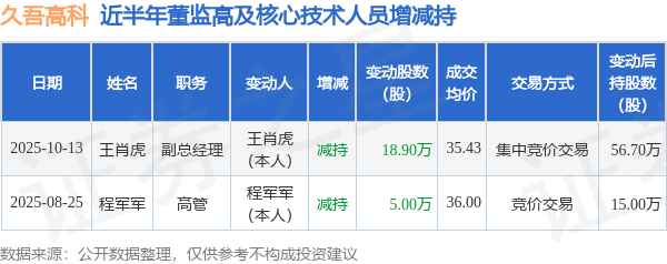 久吾高科近半年内的董监高及核心技术人员增减持详情如下: