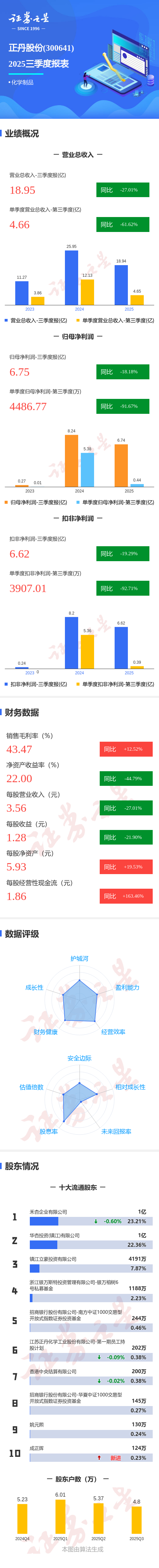 证券之星消息,正丹股份2025年三季报显示,公司主营收入18.95亿元,同比下降27.02%;归母净利润6.75亿元,同比下降18.18%;扣非净利润6.62亿元,同比下降19.29%;其中2025年第三季度,公司单季度主营收入4.66亿元,同比下降61.62%;单季度归母净利润4486.77万元,同比下降91.67%;单季度扣非净利润3907.01万元,同比下降92.71%;负债率2.25%,投资收益1191.17万元,财务费用-1678.35万元,毛利率43.47%。