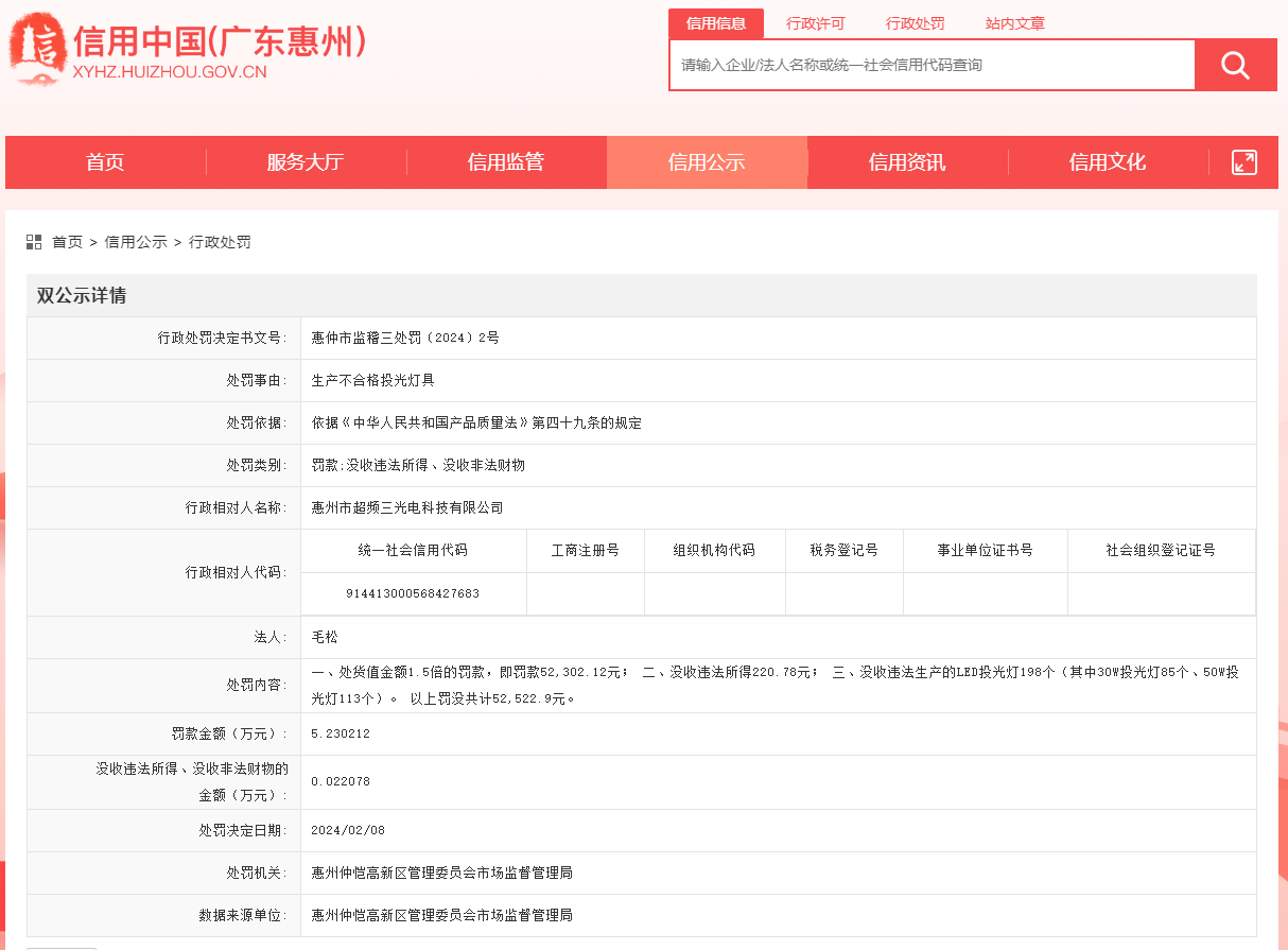 广东惠州仲恺高新区管理委员会市场监督管理局对惠州市超频三光电科技有限公司作出行政处罚