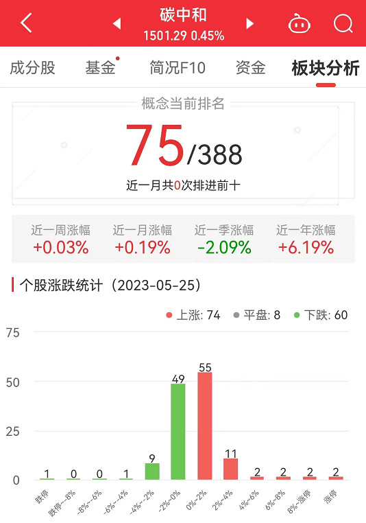 中国经济网北京5月25日讯 今日,碳中和板块整体涨幅0.45%,其中,74只股票上涨,8只股票平盘,60只股票下跌。