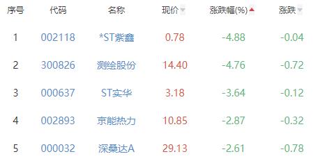 *ST紫鑫、测绘股份、ST实华、京能热力、深桑达A位列涨幅榜后五位,涨幅分别为-4.88%、-4.76%、-3.64%、-2.87%、-2.61%。