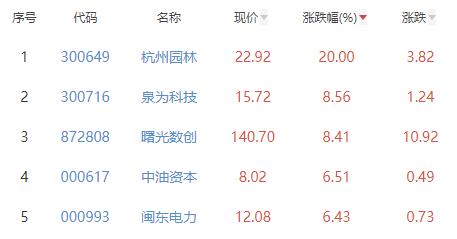 其中,杭州园林、泉为科技、曙光数创、中油资本、闽东电力位列板块涨幅前五位,涨幅分别为20.00%、8.56%、8.41%、6.51%、6.43%。