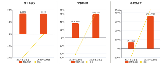 公司营业总收入为2.55亿元,较去年同报告期营业总收入减少99.22万元,同比较去年同期下降0.39%。归母净利润为3530.26万元。经营活动现金净流入为4034.86万元。