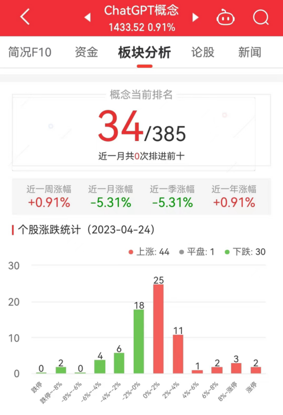 中国经济网北京4月24日讯今日,ChatGPT概念板块整体涨幅0.91%,其中,44只股票上涨,1只股票平盘,30只股票下跌。