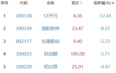 ST开元、润和软件、东港股份、同花顺、拓尔思位列涨幅榜后五位,涨幅分别为-12.45%、-8.25%、-5.72%、-5.71%、-4.47%。