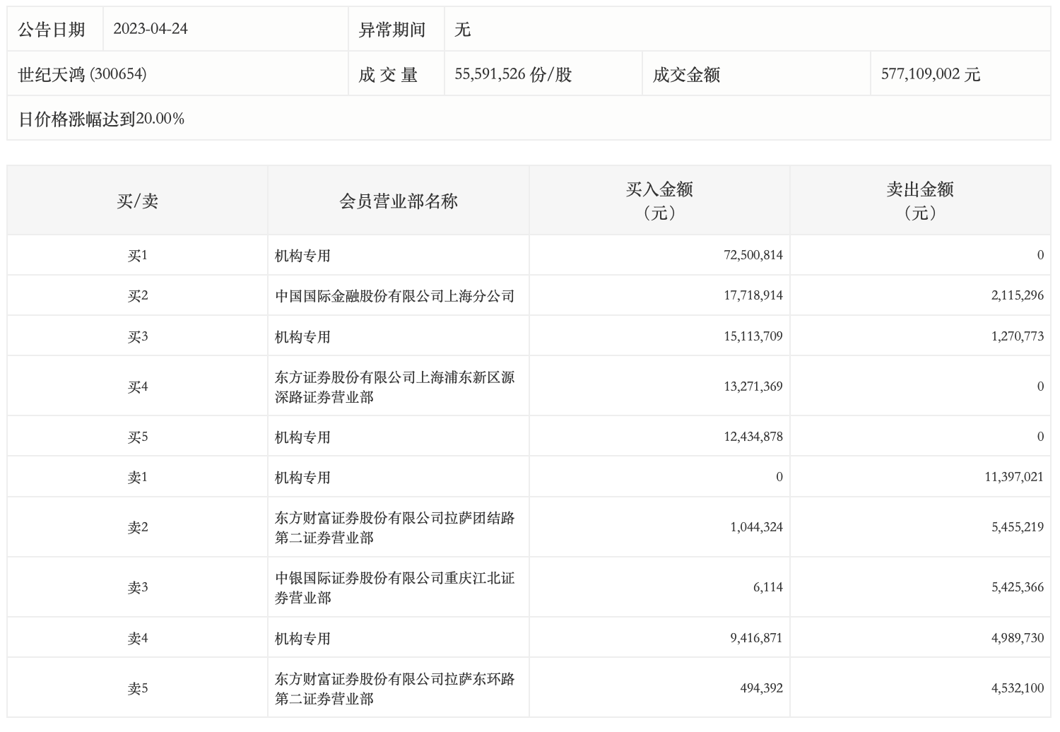 4月24日,世纪天鸿今日涨停,龙虎榜数据显示,上榜营业部席位全天成交1.77亿元,占当日总成交金额比例为30.7%。其中,买入金额为1.42亿元,卖出金额为3518.55万元,合计净买入1.07亿元。