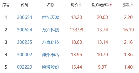 其中,世纪天鸿、万兴科技、方直科技、神州泰岳、鸿博股份位列板块涨幅前五位,涨幅分别为20.00%、13.74%、13.14%、10.79%、9.97%。
