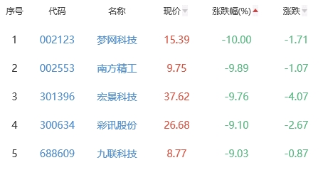 梦网科技、南方精工、宏景科技、彩讯股份、九联科技位列涨幅榜后五位,涨幅分别为-10.00%、-9.89%、-9.76%、-9.10%、-9.03%。