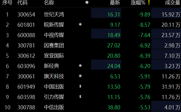 上证报中国证券网讯 5月16日,传媒板块快速走低,截至9时47分,世纪天鸿跌近10%,中视传媒、皖新传媒、新经典等跌超6%。