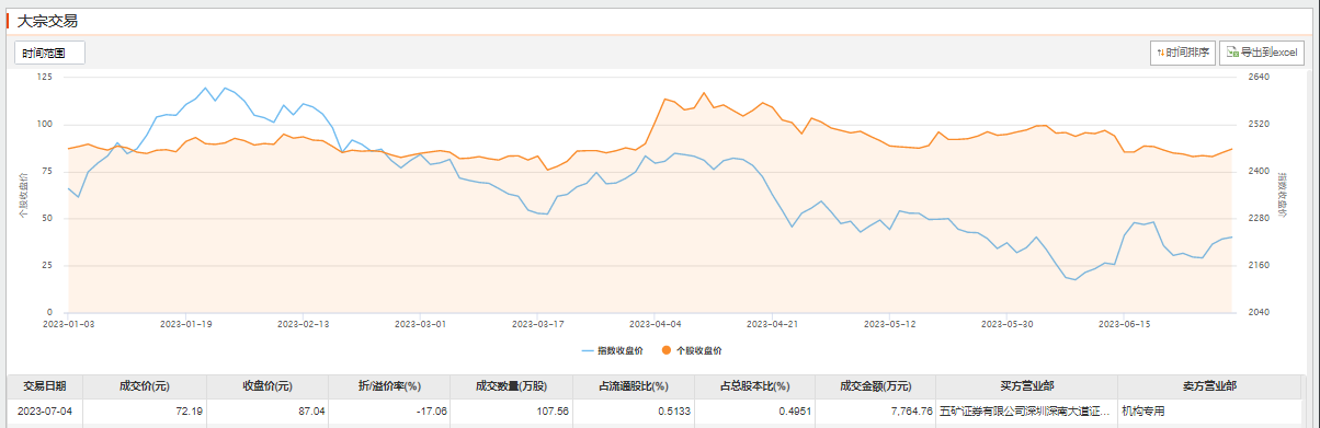 7月4日大宗交易成交107.56万股,成交额7764.76万元,占当日总成交额的11.6%,成交价72.19元,较市场收盘价87.04元折价17.06%。