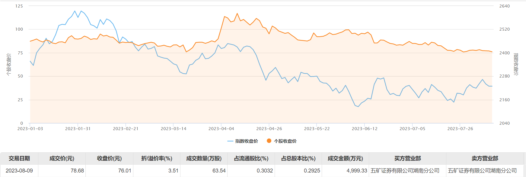 8月9日大宗交易成交63.54万股,成交额4999.33万元,占当日总成交额的26.16%,成交价78.68元,较市场收盘价76.01元溢价3.51%。