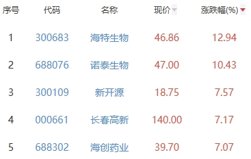 其中,海特生物、诺泰生物、新开源、长春高新、海创药业位列板块涨幅前五位,涨幅分别为12.94%、10.43%、7.57%、7.17%、7.07%。