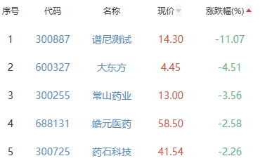 谱尼测试、大东方、常山药业、皓元医药、药石科技位列涨幅榜后五位,涨幅分别为-11.07%、-4.51%、-3.56%、-2.58%、-2.26%。