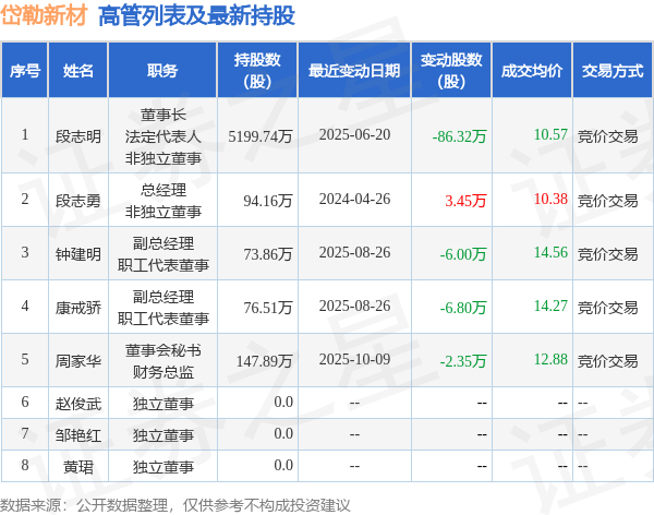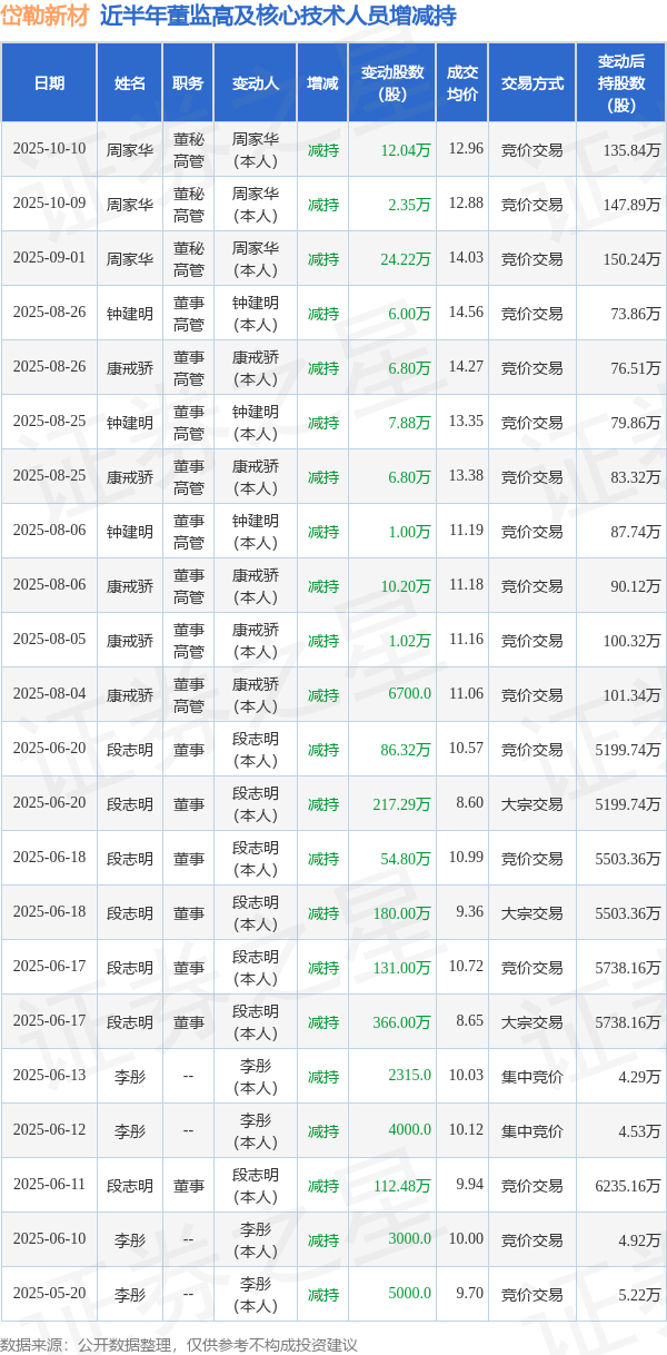 岱勒新材近半年内的董监高及核心技术人员增减持详情如下:
