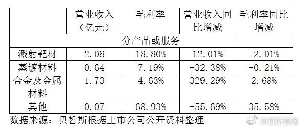 福建阿石创新材料股份有限公司从成立至今一直专注于PVD镀膜材料领域。2002年公司成立并开始涉足光学镀膜材料, 对PVD镀膜设备端、工艺端、材料端的复合理解力与综合应用能力是当前阿石创的核心竞争力,也是阿石创未来拓宽PVD应用场景、建设PVD应用新项目的核心支持力。2023年上半年,溅射靶材产品实现营收2.08亿元,同比增长12.01%。