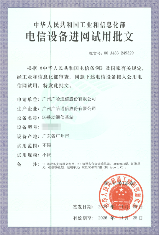 广哈通信5G移动通信基站、5G 无线数据终端获工信部电信设备进网许可证