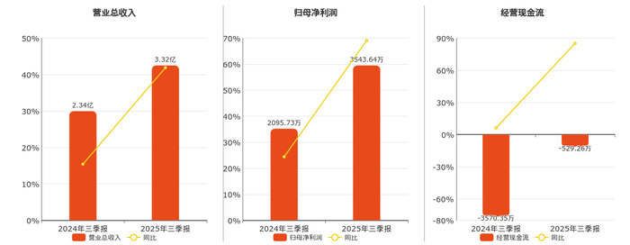 公司营业总收入为3.32亿元,较去年同报告期营业总收入增加9804.02万元,实现5年连续上涨,同比较去年同期上涨41.90%。归母净利润为3543.64万元,较去年同报告期归母净利润增加1447.91万元,实现5年连续上涨,同比较去年同期上涨69.09%。经营活动现金净流入为-529.26万元,较去年同报告期经营活动现金净流入增加3041.09万元,实现2年连续上涨。