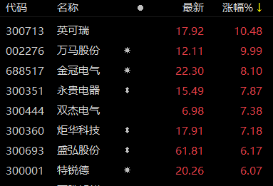 上证报中国证券网讯 5月10日上午交易时段,充电桩板块异动拉升。10时11分,英可瑞涨超10%,万马股份涨停,金冠电气、永贵电器等跟涨。