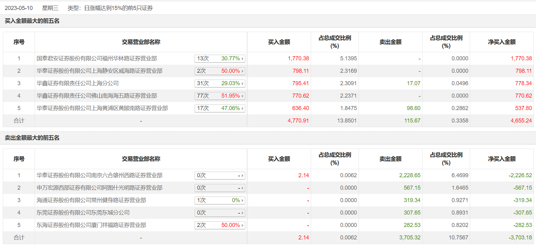 具体来看,国泰君安证券福州华林路证券营业部、华泰证券上海静安区威海路证券营业部分别买入1770.38万元、798.11万元;华泰证券南京六合雄州西路证券营业部、申万宏源西部证券有限公司阿图什光明路证券营业部分别卖出2228.65万元、567.15万元。