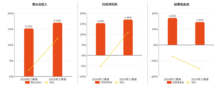 公司营业总收入为9.35亿元。归母净利润为1.88亿元。经营活动现金净流入为1.54亿元,较去年同报告期经营活动现金净流入减少2771.22万元,同比较去年同期下降15.24%。